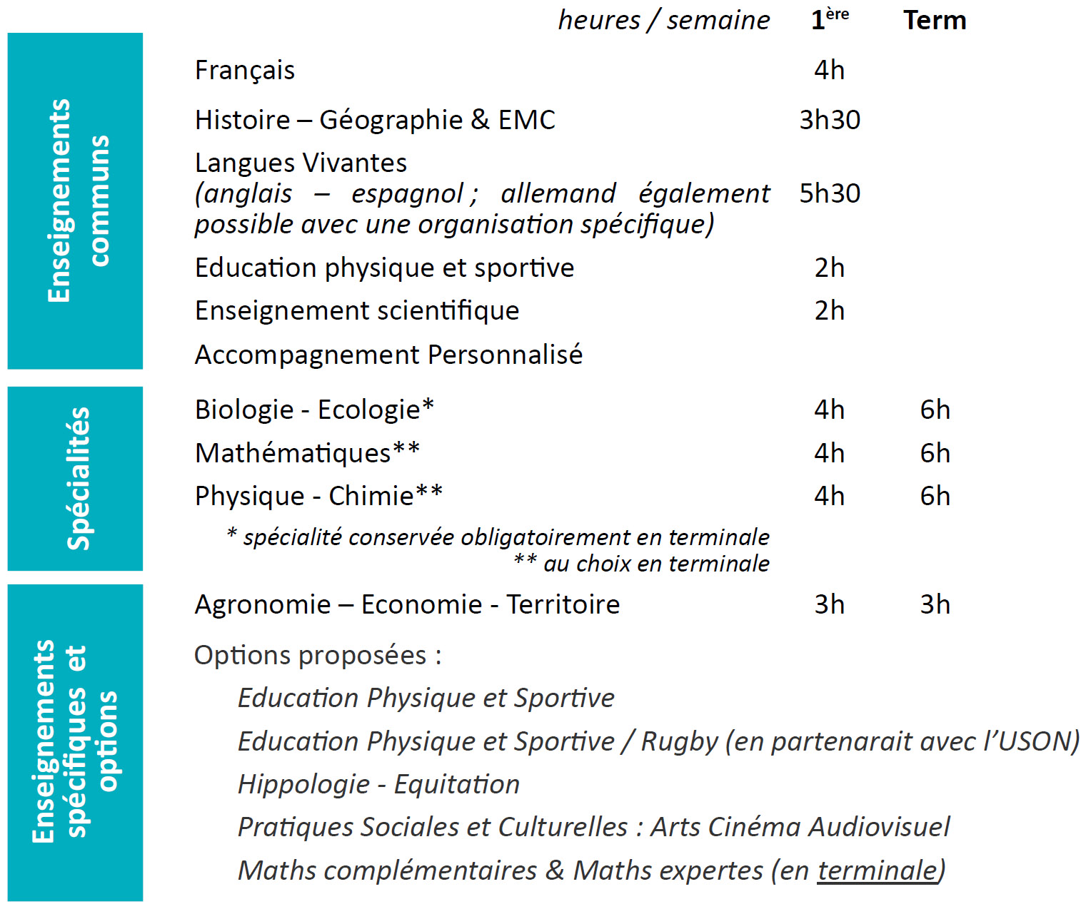 - enseignements communs (identiques à ceux de l’Education Nationale) + spécialités scientifiques + Agronomie – Economie - Territoire