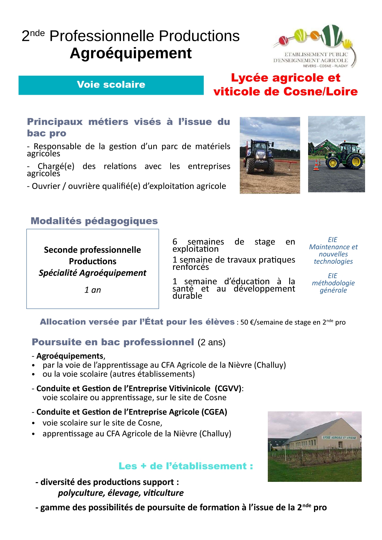 La seconde professionnelle productions spécialité Agroéquipement (AE) constitue la première année d'un cycle de 3 ans conduisant au Baccalauréat Professionnel Agroéquiment.